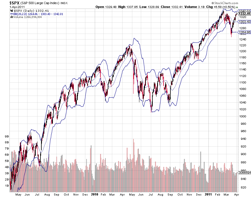 Die Wahrscheinlichkeit ist daher recht groß, dass es zu einer Reaktion kommt, die bis zum mittleren Bolliger läuft. Leider kann ich die Wahrscheinlichkeit noch nicht genau beziffern (habe jetzt ein nettes Back-Testing-Tool, das ich genau für so etwas hernehmen will) aber ich muss und will davor warnen, dass hier niemand auf die Idee kommen könnte, dass eine Korrektur ab hier so kommen muss, denn wie leicht zu sehen ist, war weder im Juni 2009 noch im Sept. 2010 ein solcher Retest des MA20 zu sehen. Daher will ich shorts sehr sehr vorsichtig angehen – am liebsten gar nicht, aber das muss sich noch zeigen im Verlauf der Woche. Der Chart zeigt zudem auch recht klar, dass im Falle von Kursbildungen über mittleren Bollinger die long-Seite zu favorisieren ist. Eindeutiger gehts eigentlich gar nicht…
