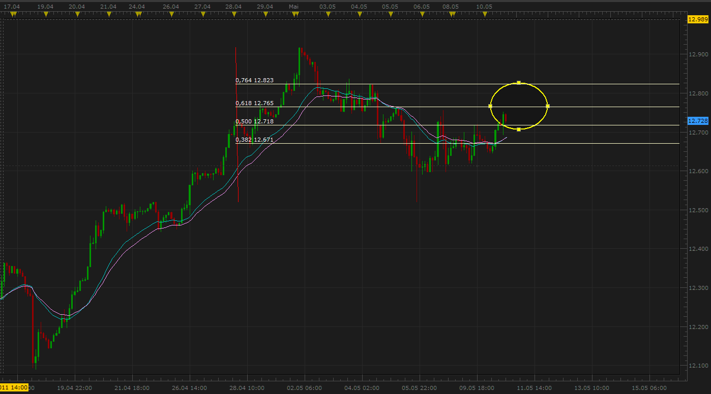 Ich werde hier NICHT shorten, weil einfach der übergeordnete Aufwärtstrend intakt ist und weil es mir deshalb die Regeln verbieten Fibos abwärts zu traden. Für mich zählt weiter das Low von letzter Woche. So habe ich auch nur kurze longs getradet heute und auch gestern. Fakt aber ist, dass die Situation, die ich im Chart unten darstelle noch vor wenigen Wochen zu starken Käufen und einer 2% Aufwärtsbewegung geführt hätte: