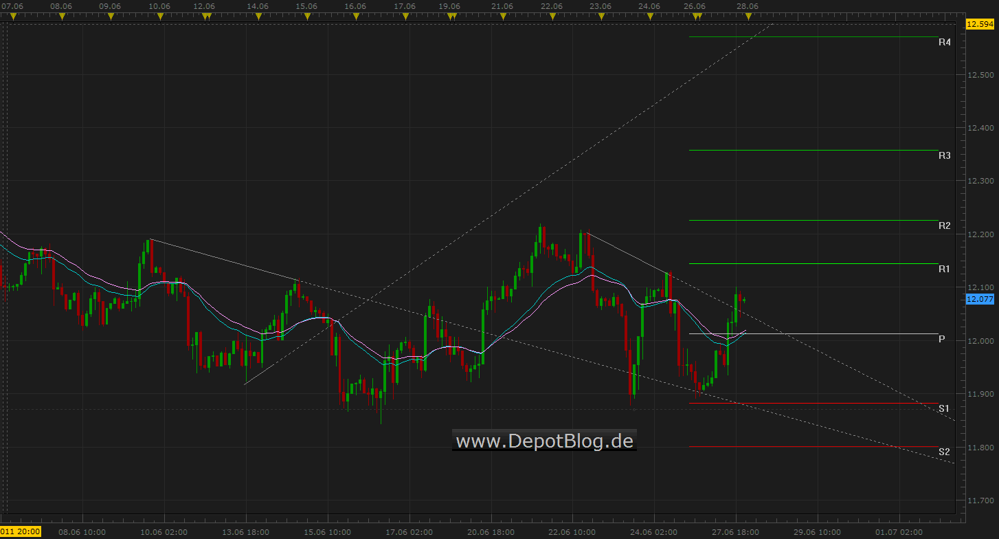 Was mich aber insgesamt bullish stimmt ist die Volumenkerze am vergangenen Freitag. Heute war das Volumen im Vergleich zu Freitag auch wieder um die Hälfte reduziert und im Rahmen, morgen sollte es idealer Weise mit steigenden Kursen anziehen. Dann wäre der Drops gelutscht. Ich bin da zuversichtlich gerade wegen der längst “eingepreisten” Griechenland-Sommerloch-Füllung der Zeitungen. Ich habe meine Position allerdings halbiert und will erst sehen wie hysterisch der Euro auf Griechenlands Entscheidung reagiert. Wie gesagt, ideal wäre eine satt grüne Kerze mit anziehendem Volumen und an Volumen dürfte es morgen sicher nicht mangeln…