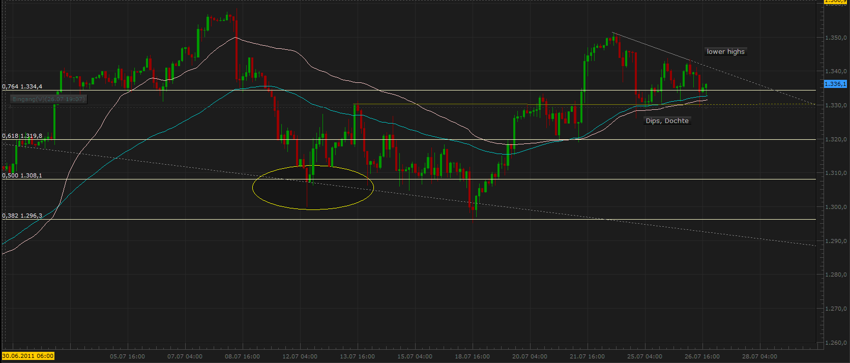 eine kleine aber feine Patt-Situation, die wir derzeit in den Märkten vorfinden. Zum Einen der massive Support bei 1330, zum Anderen die lower highs, die sich seit Freitagshoch bilden konnten: