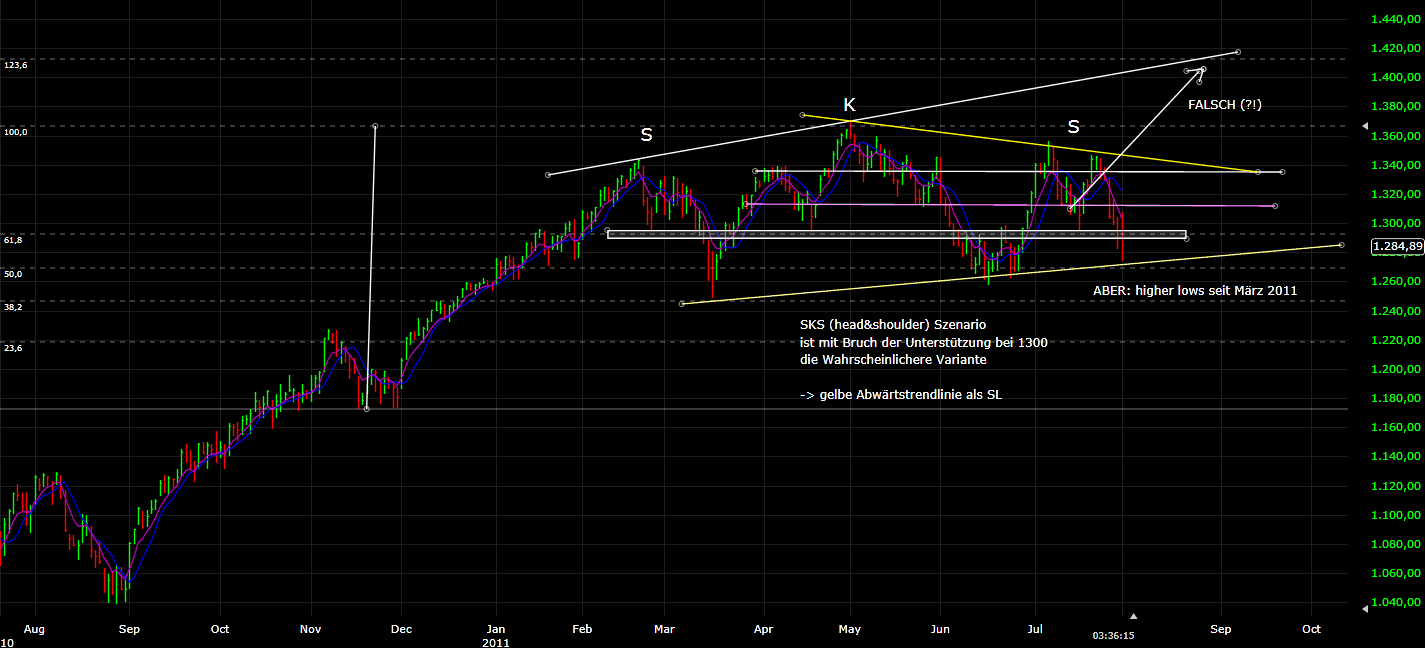 Die SKS ist nicht zu übersehen. Bei Bruch der unteren gelben Unterstützung werde ich in Deckung gehen müssen und einen Bärenmarkt für gestartet erklären. Das könnte erste Ziele im Bereich von 1180 aktivieren. Nicht selten aber habe ich schon klassische Bärenfallen erlebt wenn die Situation zu offensichtlich war. Die Lage ist ernst, keine Frage, aber man muss nüchtern Festhalten, dass es noch hält entlang der Unterstützung. Alles in allem sieht das aber nach einem übergeordneten Topping-Prozess seit Feb. diesen Jahres aus.