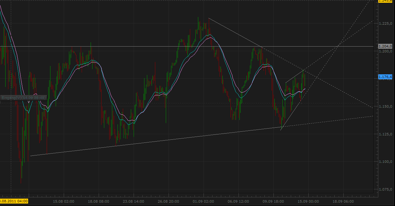 Bislang war die Bewegung seit Lows vom Montag nicht sonderlich vertrauenserweckend oder stark. Im Gegenteil, ich sehe ein “ending diagonal”, allerdings auch Chancen für einen markanten Ausbruch oberhalb von 1182. Man wird -wie immer- sehen müssen!