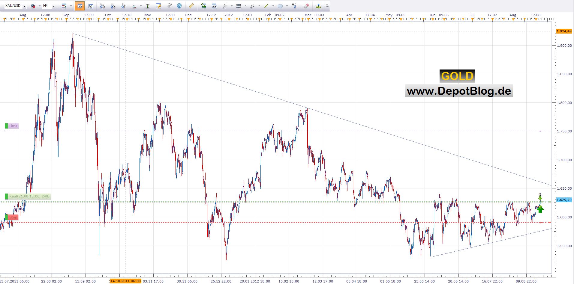 Anfangen will ich mit 2 Trades, die seit Anfang dieser Woche laufen und zwar auf die Metallmärkte Gold und Silber. Gegen Ende August neigen sie zu haussieren, da sich Schmuckhersteller mit diesen Rohstoffen um diese Zeit eindecken um die Produktion für das Weihnachtsgeschäft zu ermöglichen. Die Urlaubszeit ist beendet und die angestellten der großen Nachfrager kommen zurück zu ihren Arbeitsplätzen und kaufen ein. Das schafft einen Überhang auf der Nachfrageseite und hält an bis ungefähr Anfang/Mitte Oktober. So lange will ich Gold und Silber halten. Bei Gold bin ich mittlerweile mit einer riesigen Position drin, reingekommen bei 1.625, pyramidisiert bei 1.626 und 27. Bei Silber bin ich seit 28,19 dabei. Beide Einstiege waren knapp vor Ausbruch aus der Bodenbildungsformation.
