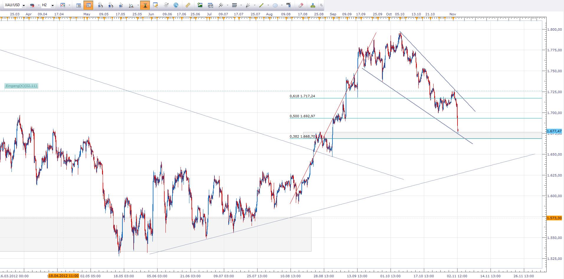 Ich sehe zunächst einmal eine Beschleunigung der Abwärtsbewegung nach Unterschreitung der Lows bei 1700, die immerhin gut eine Woche halten konnten. Klar dabei: Trader, die dort auf eine Wiederaufnahme der Aufwärtsbewegung wetteten, hatten dort ihren Stopp und sind bei Unterschreitung ausgestoppt worden. Die entstandene “scharfe” Bewegung ist daher keine Überraschung sondern logische Folge. Interessant wird es nun zu sehen wie das wichtige Fibo-62% Level hält, denn es liegt günstig an alten Widerständen bzw. Supports. Zudem bildet sich ein Keil, der im Falle des Verlassens auf der oberen Seite ein gutes Setting für neue Long-Positionen bietet.