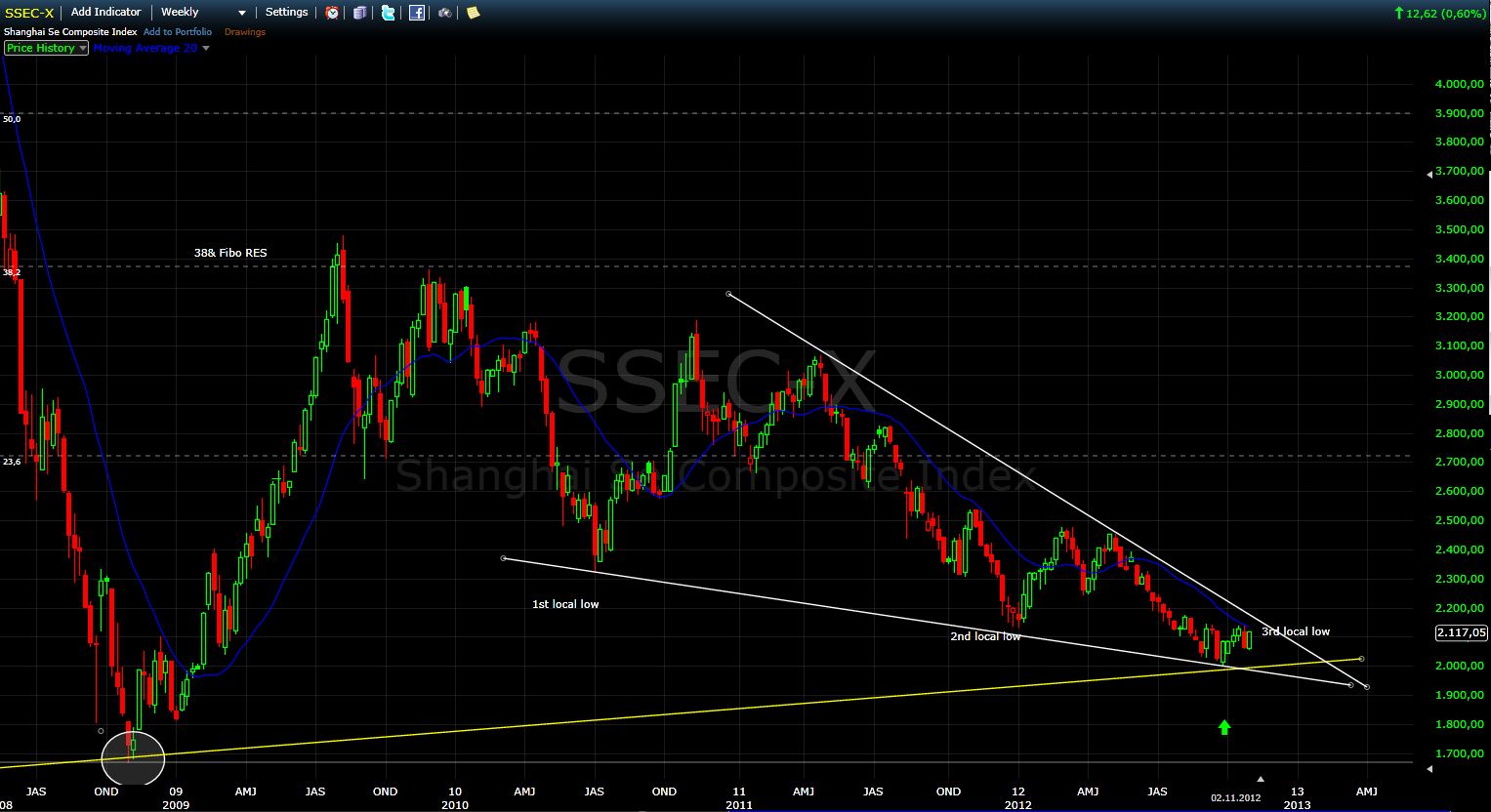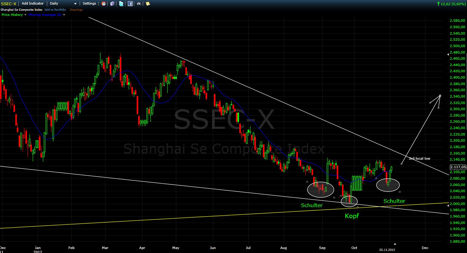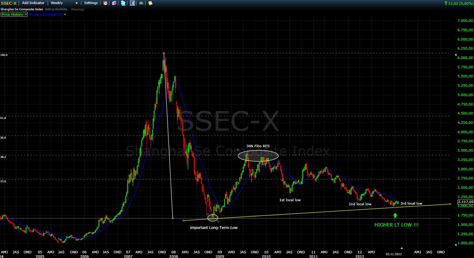 Ich schaue da eigentlich immer mit einem Auge drauf, weil die chin. Märkte overnight für Bewegung sorgen können. Nach letzter Woche aber, war in der Presse zu lesen, dass es einen Führungswechsel geben soll (Hu Jintao geht und wird offenbar von Xi Jingping ersetzt). Das ist ein wichtiges fundamentales Ereignis für einen Aktienmarkt und daher schaute ich wie der chinesische Aktienmarkt darauf reagiert. Was soll ich sagen? Ich sehe BUY-Signale auf allen Zeitebenen. So etwas hatte ich bislang auch noch nicht erlebt.
