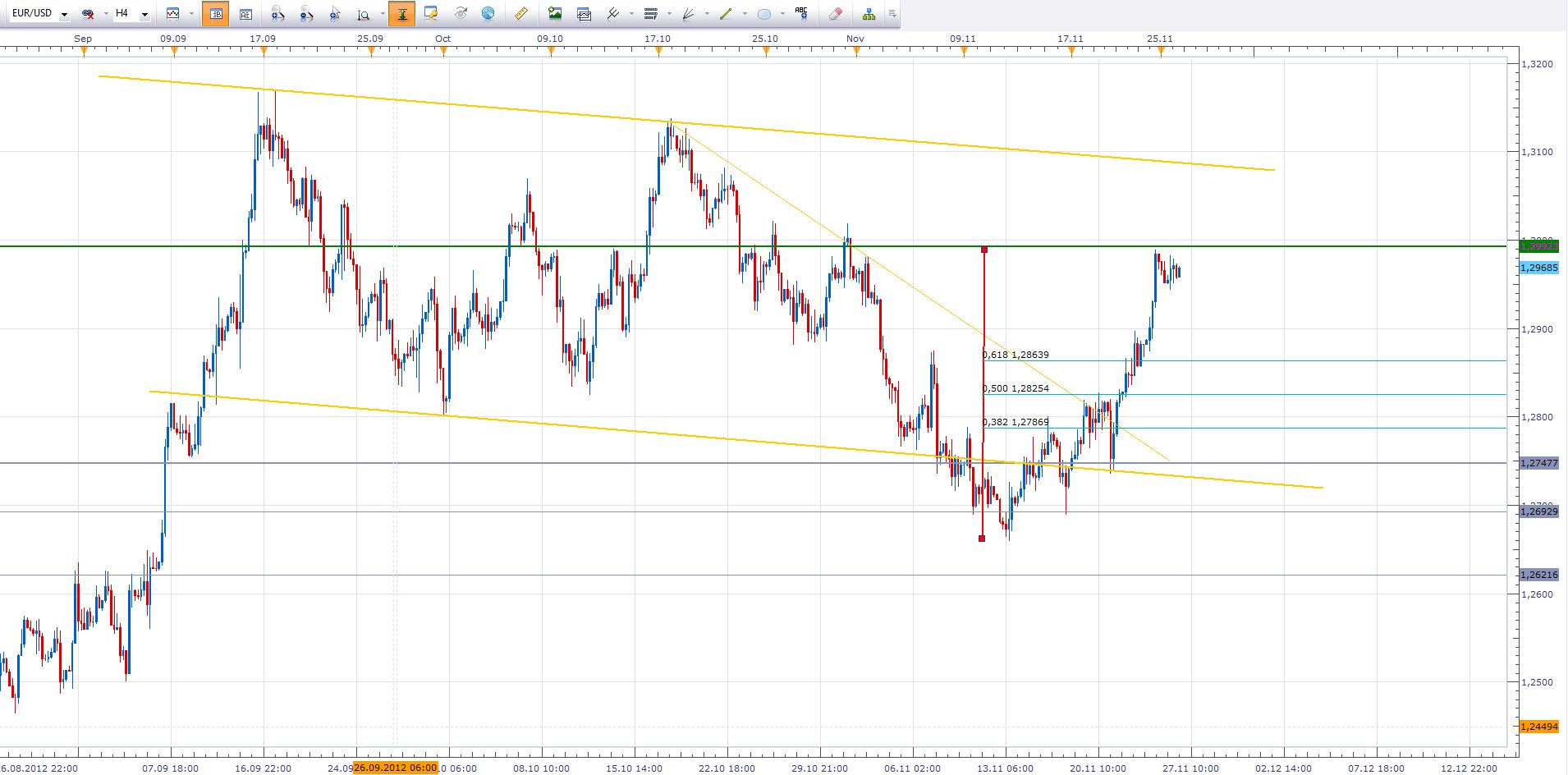 sollte es zu einem Rücksetzer kommen, dürften viele Bullen auf das 50% Retracement schauen (Bild unten), sollte die 1,30 fallen, bleibt nur noch die obere Gelbe Linie zum Überwinden (sollte wesentlich leichter fallen als die 1,30!).