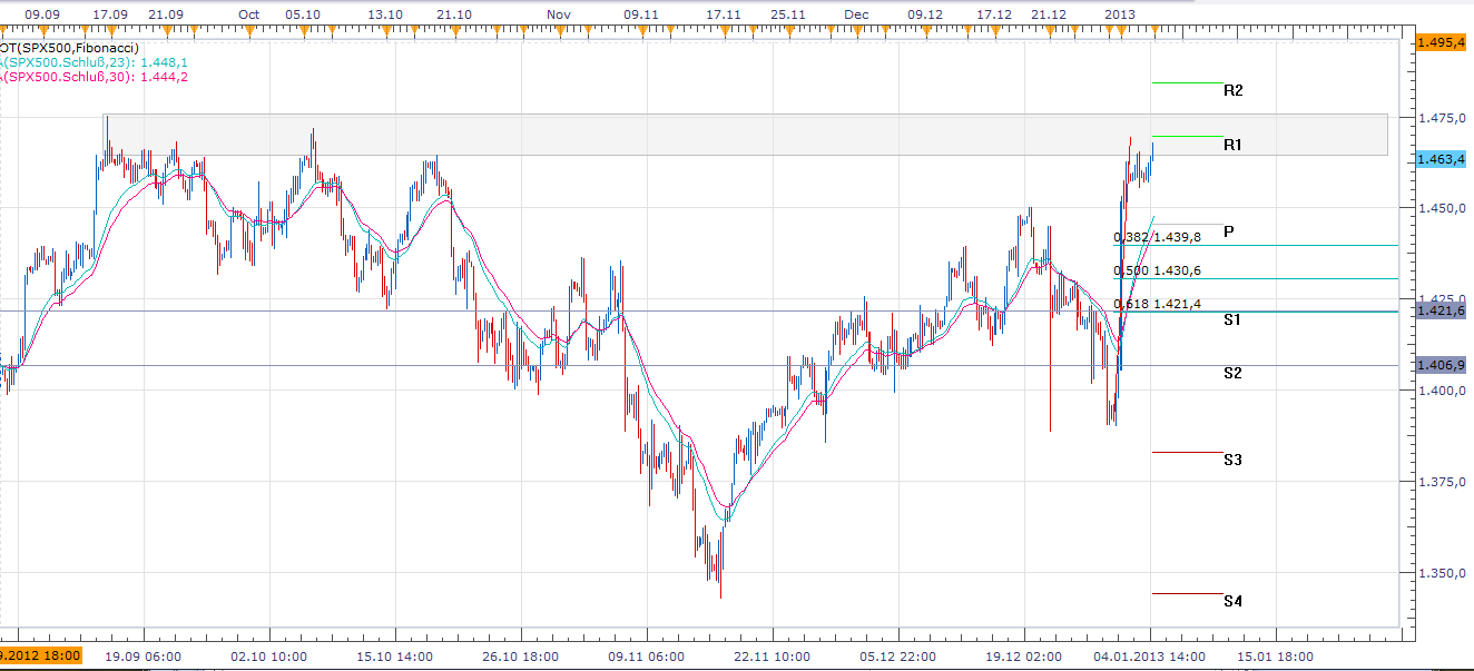 Ich denke wir sehen in Kürze eine Korrekturbewegung der “Fiscal-Cliff” Erroption, die von einen wahnsinnigen short-squeeze begleitet bzw. verursacht wurde. Ein Gap von über 20 Punkten wirkt normalerweise wie ein schwarzes Loch. Mir scheint es fast unmöglich, dass der Markt es da so offen liegen lässt. Je früher es geschlossen wird, desto besser.