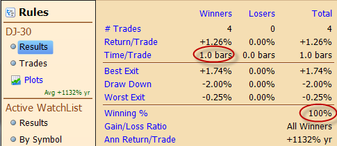Kurzfristig für den Start der Woche habe ich folgenden Backtest für euch: Der Dow legte 8 grüne Tage in Folge hin. Shorte am 8. grünen Tag (letzter Freitag). Verkaufe am ersten roten Handelstag. 100% Trefferquote (aber Vorsicht: Dieses Setting gab es nur 4x in der jüngsten Zeit):