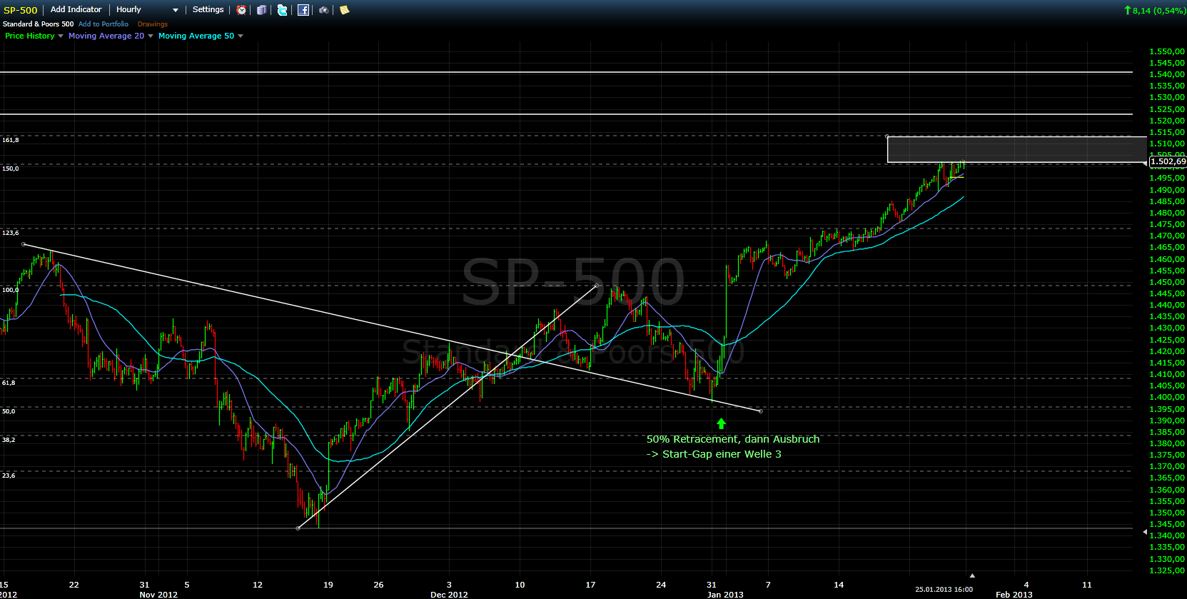 Ich spare mir für’s Erste das Gefasel, denn ich liege seit mehr als 2 Wochen daneben. Ich habe das zu Monatsbeginn komplett falsch eingeschätzt und konnte mich von der negativen Voreinstellung während der gesamten Janauar-Zeit nicht lösen, so dass mir nicht nur Gewinne entgangen sind sondern auch 4 Trades mit Max-Stopp-Loss kassierte. Die Bullen sind mittelfristig am Zug, größeres Ziel der Bewegung sollte im Bereich 1510 – 1515 im S&P sein, das würde auch mit den 14.000 im Dow ganz gut übereinstimmen. Diese Marke sollte angegriffen werden, davon gehen denke ich alle aus.