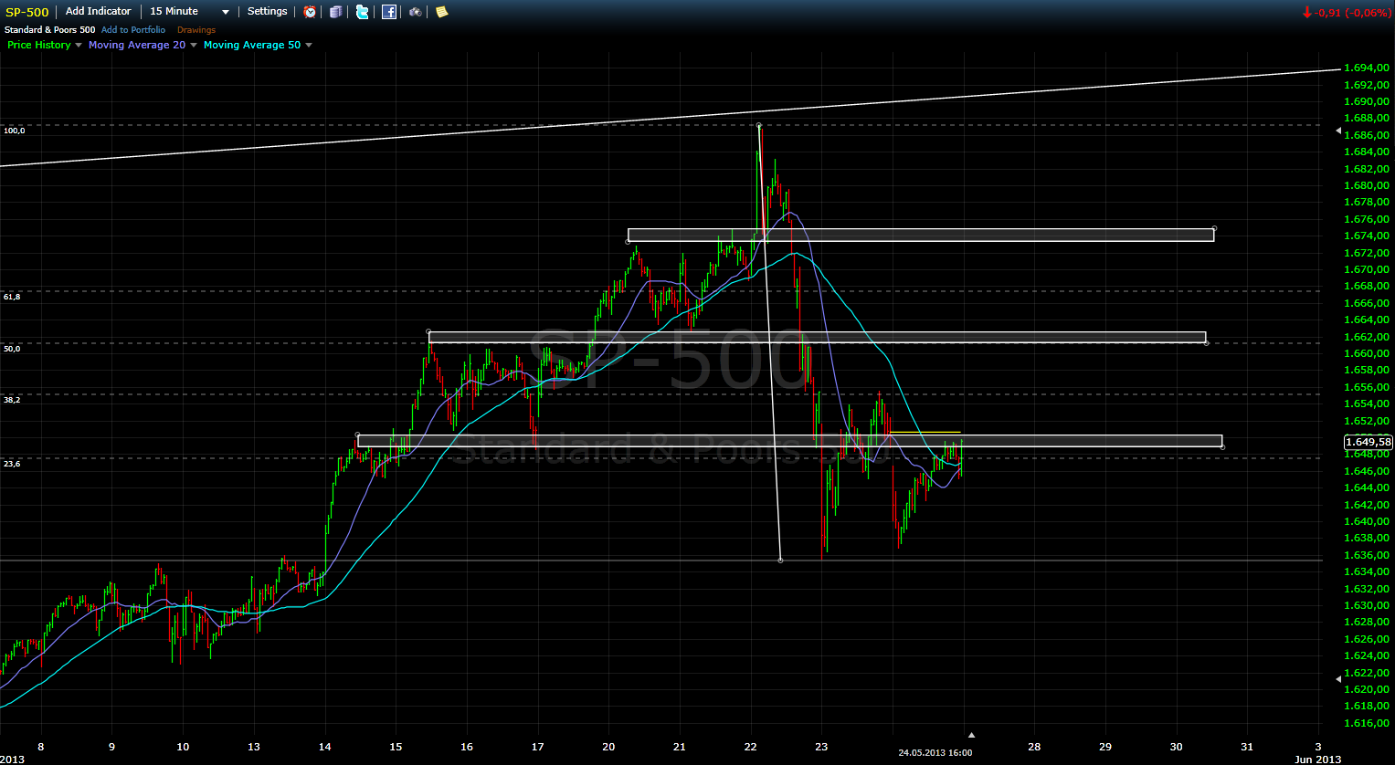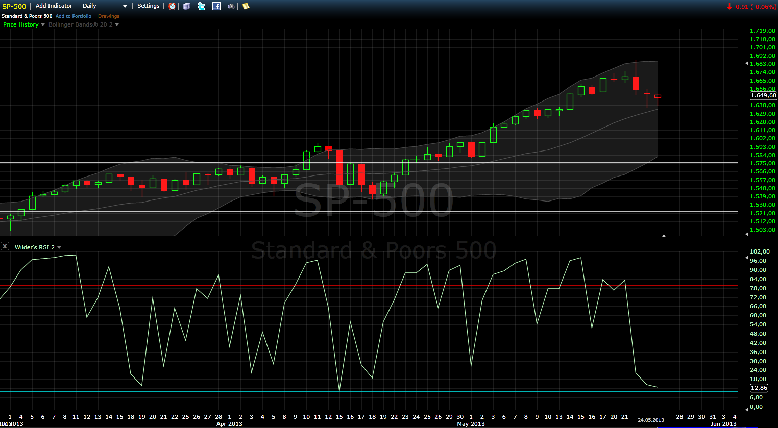 Machen wir’s kurz diesmal! Die Saisonalität bevorzugt Bullen diesmal. Am Montag ist Memorial Day, die Tradingtage danach sind alle bullish (Dienstag bis Freitag einschließlich). Auch der Juni am Montag und Dienstag kommender Woche ist äußerst bullish, daher gehe ich von einer Wiederaufnahme der Bullenbewegung aus. Ich handle Longs aber mit 3/4 Positionen, denn die Abwärtsbewegung letzte Woche zeigte doch ganz deutlich wie eng die Tür werden kann wenn alle gleichzeitig durch wollen. Hier die Charts, wie immer vom großen ins kleine Bild: