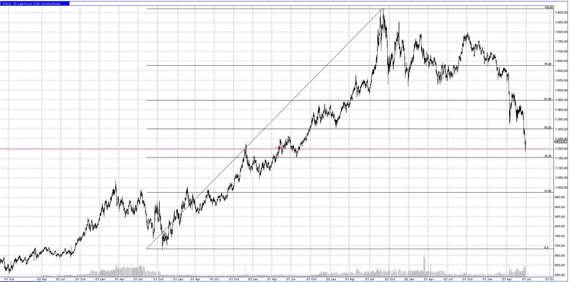 Alles in allem hat die Abwärtsbewegung perfekt am 62,8% Fibo-Retracement aufgsetzt. Eine mehrfache Unterstützung, v.a. der glatte Preis von 1200$ lädt förmlich ein für eine Gegenbewegung. Für mich ist die Chance hier groß, dass sich die Bären verausgabt haben und Bullen sich zeigen können. Der ein oder andere wird sicher bereits bemerkt haben, dass ich Long bin seit 1200 in Gold und bei etwa 1220 aufgestockt habe. Hier geht es zu meinem Wikifolio. Stoff für eine satte Gegenbewegung liefert auch der historisch einmalige Anteil an Short-Positionen, die irgendwann gedeckt werden müssen durch Käufe: http://www.fuw.ch/article/der-chart-des-tages-85/ – Ein echter Chart des Tages!!