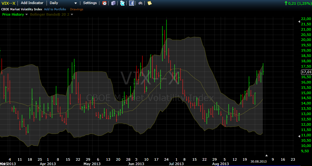 Wenn ihr mich fragt, der langfristige Support (gelbe Linie) im SPX sieht stark aus im Chart oben. Der Chart unten zeigt: Gleichzeitig ist der VIX am oberen Bollinger. Es ist in meinen Augen daher wahrscheinlich, dass er jetzt in Richtung mittlere Linie zurück läuft. Ob es dann weiter steigt oder nicht in einigen Tagen weiß niemand, aber kurzfristig zeigen die Dochte, dass es runter geht mit dem VIX.