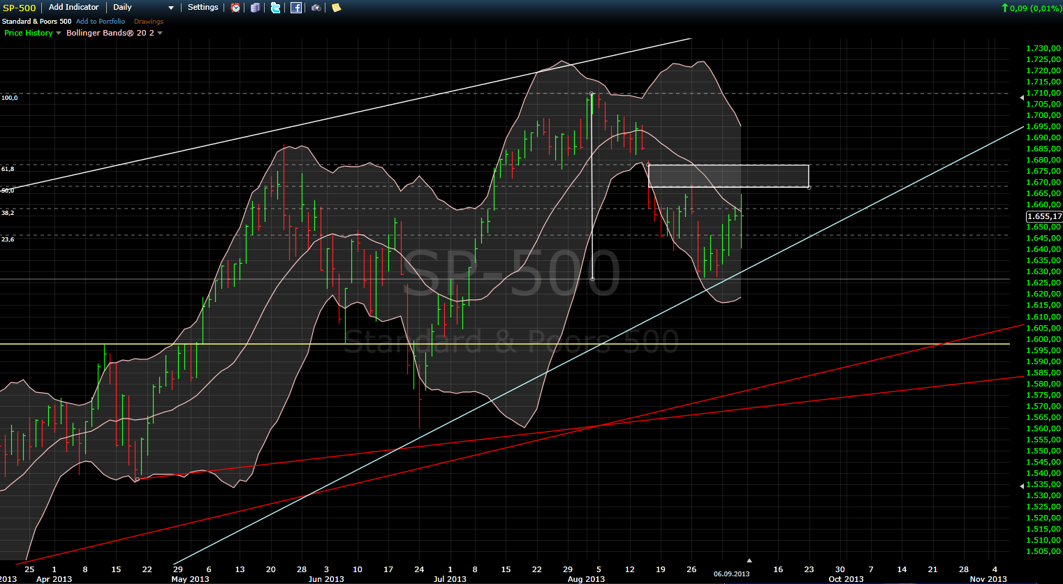 Möge sich jeder seine Lieblingsrichtung aussuchen ;-) Ich hab’ echt keinen Plan wie es jetzt weiter gehen wird. Die Bären könnten saisonal im Vorteil sein. In diesem Fall würden spätestens im Bereich 1667 bis 1677 Bärenaktionen zu sehen sein. Ich werde es wahrscheinlich kurz vor dem oberen Gap bei 1675 mit neuen Shorts versuchen wenn es soweit kommt. Dann aber nur keine Positionen. Das Damoklesschwert Syrien schwebt ja nach wie vor über den Märkten und ich finde die Verunsicherung lässt sich sehr gut in den Charts lesen…