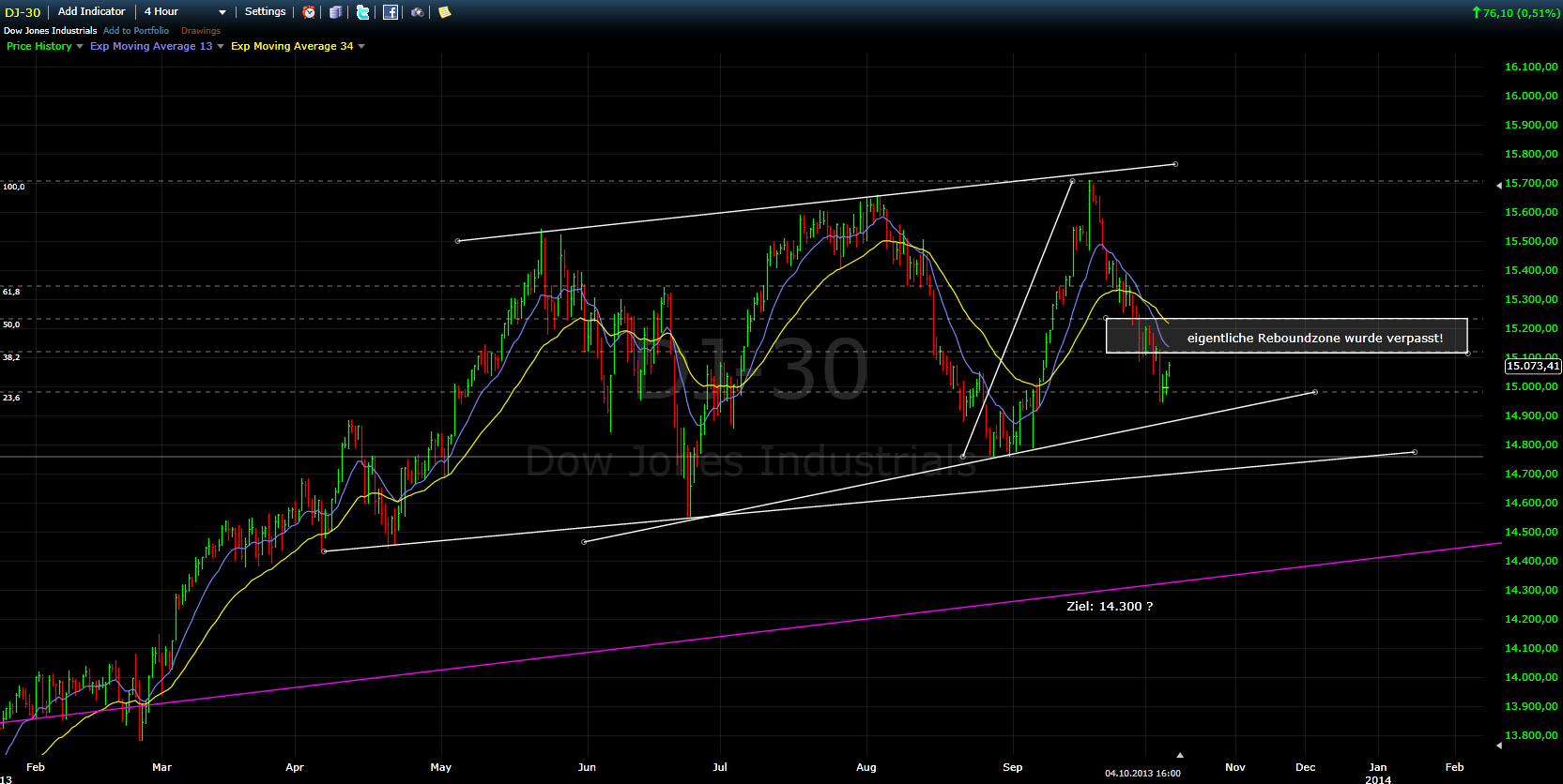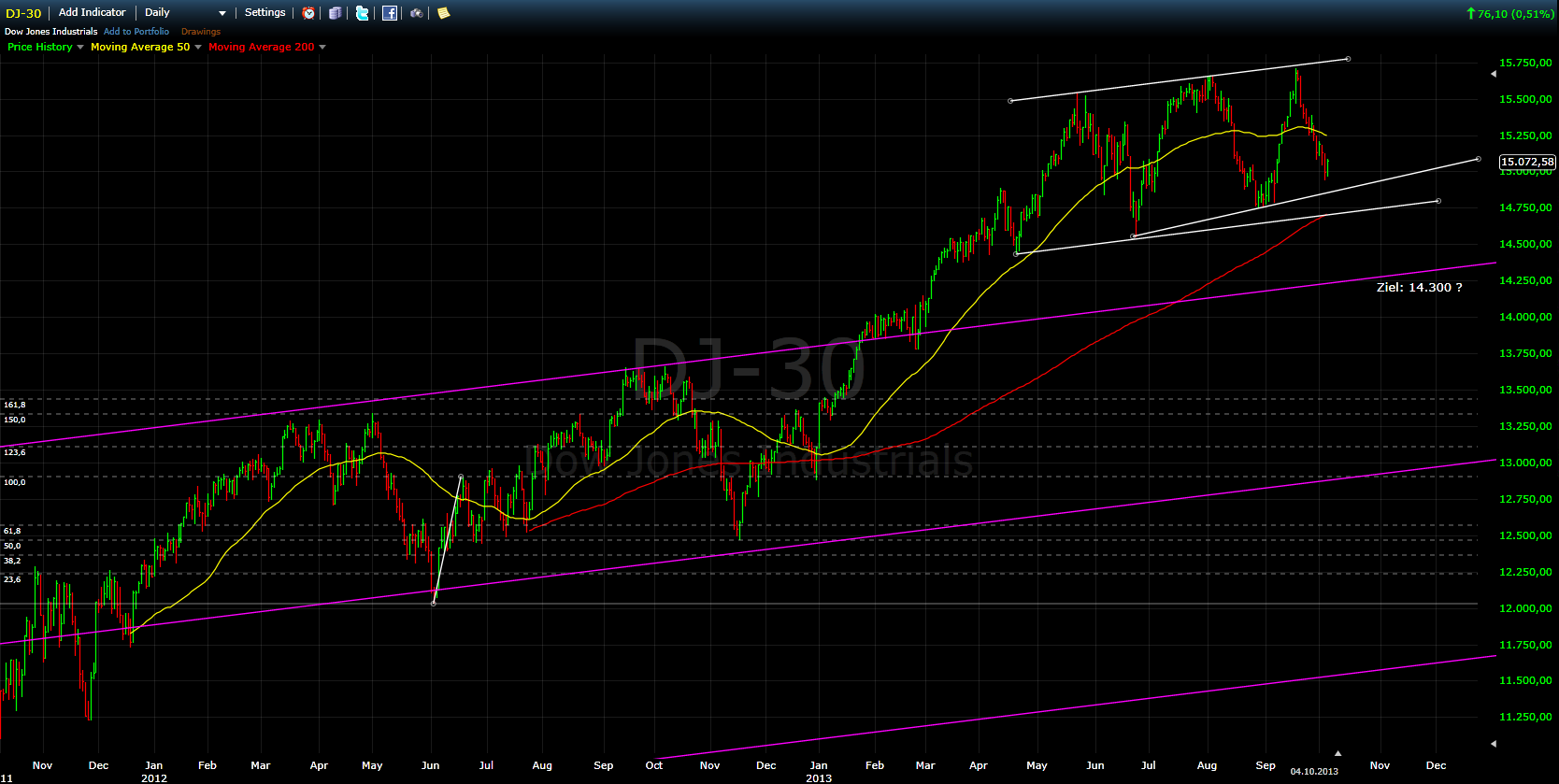 Auf der anderen Seite haben Bullen sicherlich auch sehr gute und griffige Argumente für eine Fortsetzung der Rallye. Zum einen der wie bereits erwähnt deutlich wahrnehmbare Abprall am MA50, zum anderen spricht für eine neue Rallye einfach die Tatsache, dass das letzte Quartal nun gestartet wurde und Geld einfließen dürfte. Die vergangenen kleineren Rücksetzer hatten stets ein klares “Verunsicherngsthema”. Auch diesmal ist es der Fall und daher denke ich, dass jede Entscheidung der Politik, die ein Ende des Shutdowns oder er Schuldensituation des US-Haushaltes mit sich brint, wieder eine neue große Rallye auslösen wird.