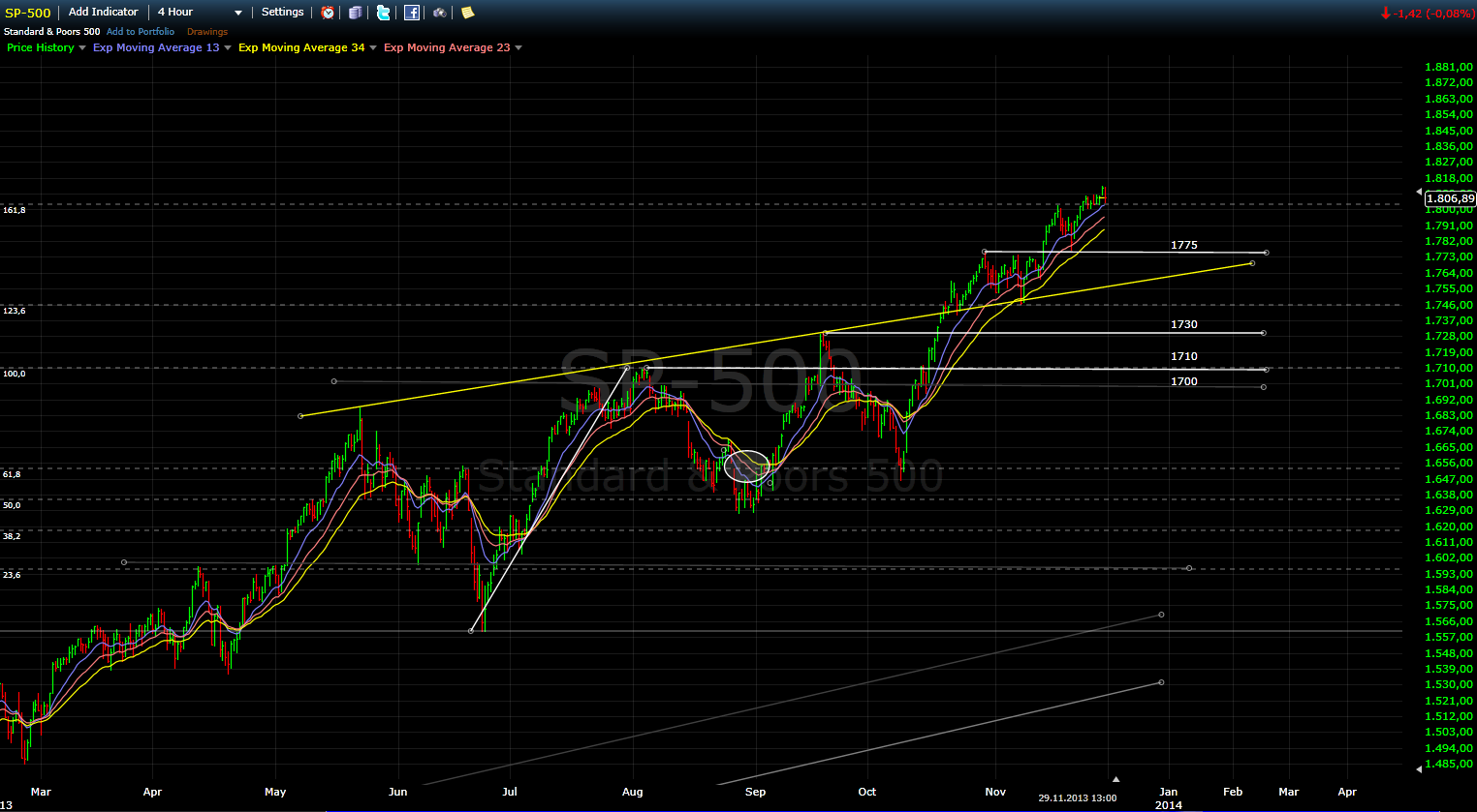 Kommen wir zum Markt, da tut sich nämlich wieder einiges. Zunächst einmal: Nein, ich rufe nicht das Top aus. Das Top erwarte ich im Januar wenn die Diskussionen rund um den Haushalt der US-Kommunen wieder entfachen werden. Bislang habe ich seit der letzten Vertagungsentscheidung keinerlei Bewegung hin zu einer endgültigen Lösung bei den US-Komikern ähh .. Politikern sehen können. Die Märkte interessiert das aber noch nicht und wenn es keinen Grund für eine Massenumstimmung gibt, gibt es auch keinen Grund auf ein Drehen des Marktes zu spekulieren. Fertig aus. Was durchaus möglich ist, wäre aber ein leichter Rückgang bis in den 1760er Bereich. Dazu braucht es einen roten Montag. Wenn Freitag und Montag rot sind, sind das sehr gute Indikatoren für eine anstehende Korrektur. Auf der anderen Seite ist Monatsanfang und daher haben die Bullen auch ein Wörtchen mitzureden am morgigen 2.12.