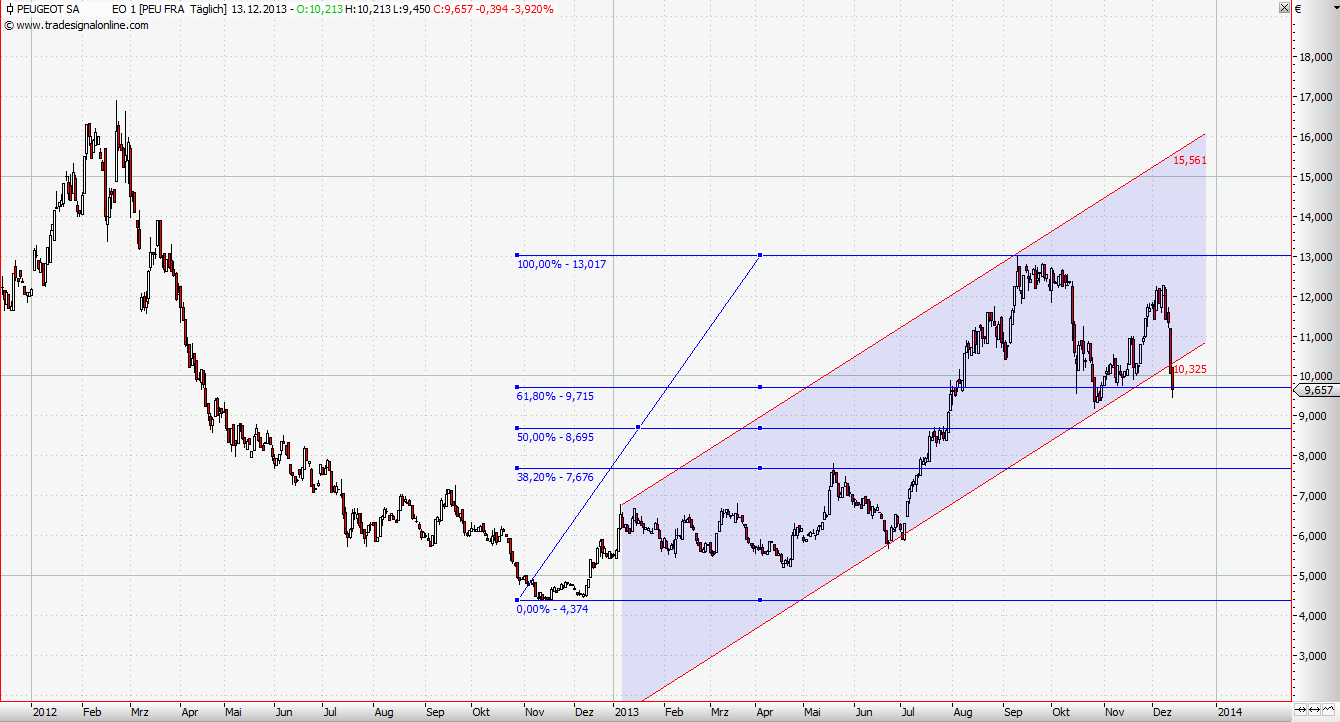 Kurzfristig muss ich aber mit -19% in 4 Tagen (auch selten erlebt so was…) das Feld räumen. Peugeot bleibt aber auf der Watchlist und wird bei neuen Kaufsignalen wieder dazu genommen. Auch weil der Staat hier notfalls eingreifen wird, falls es richtig kritisch wird. Die Situation erinnert mich an GM und Ford in 2009. Ich denke nach unten sollte es aufgrund der Wichtigkeit des Unternehmens für Frankreich recht überschaubar bleiben wenngleich die Unternehmensergebnisse nach wie vor miserabel sind, sich aber nach und nach zu stabilisieren scheinen. Wichtig wird aber sein, dass im Bereich 8€ wieder Käufer auftauchen; wäre dann ein klassisches Retracement. Für mich jedenfalls eine Aktie, die ich in 2014 long handeln werde wenn sich wieder entsprechende Kaufsignale ergeben.