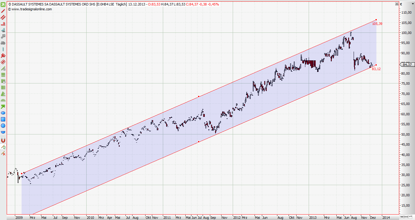 Dassault Systems. Eine französische SW-Firma, Weltmarktführer in 3D Konstruktions-SW. CATIA, ein Produkt von denen, wird vielleicht der ein oder andere kennen. Der Kauf kommt aufgrund des lanfristigen Channels seit 2009. Eine solche Aktie wünscht sich jeder langfristig orientierte Anleger in seinem Depot. Hat einen Ritt auf der Kanonenkugel hinter sich seit 2009. Wert verdreifacht und aktuell auch schön im Kanal aufgesetzt. Unter 80 werde ich die Notbremse ziehen. Nach oben bis 100€, gutes ChanceRisikoVerhältnis.