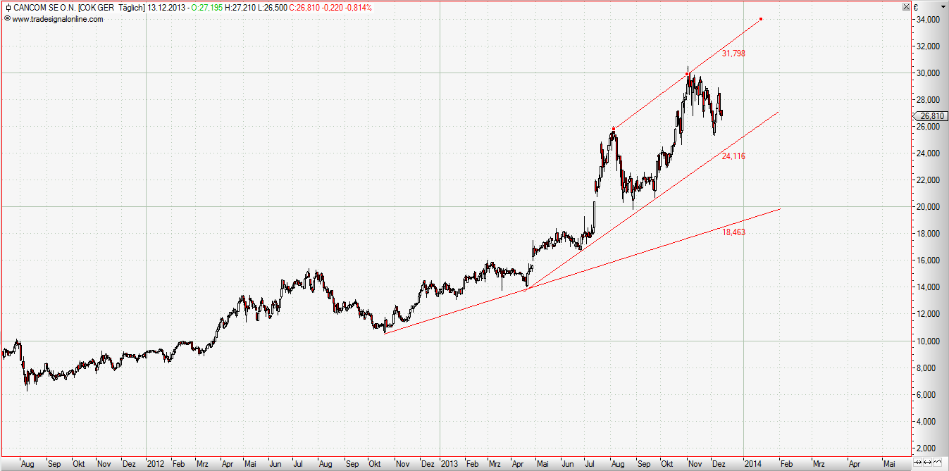 Cancom: Seit 2012 die 10€ überwunden wurden, befindet sich die Aktie im Höhenflug. So stellt man sich wohl die ideale Aktie vor. Seit der 30€ Marke ist die Aktie in einer Konsolidierungsphase. Mittlerweile zwar kein fundameltales Schnäppchen mehr, trotzdem ist die Chance in meinen Augen nicht schlecht die 30€ nochmal anzutesten. Wichtige Unterstützung (=mein Stopp) bei 26,00€.