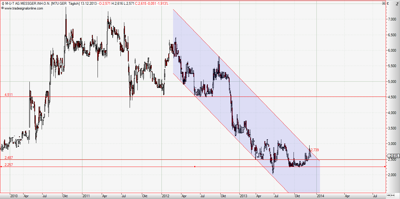 M-U-T AG. Ein echter Small-Cap und auch einziger Wackelkandidat, da ist der Name irgendwie Programm…; Der Chart zeigt schon, dass es sich hierbei um einen ganz anderen Trade handelt. Die Aktie vollzieht derzeit eine Turaround-Formation aus dem intakten Downtrend. Hier muss ich besonders aufpassen, v.a. weil es fundamental nicht 100%ig positiv aussieht, da lügt der Markt wie unten zu sehen ist auch wieder einmal nicht – klarer Downtrend. Fundamental ist der Cashbestand sowie rückläufiger Umsatz in Q3 sind von mir als niO einzustufen. Ins Depot kommt die Aktie dennoch, v.a. aufgrund der fundamentalen Bewertung (ca. 10Mio Markt-Cap bei 40 Mio Umsatz) und dem ersten Ausbruchsversuch in Richtung 3€. Große Charttechnische Widerstände sind bei Überschreitung von 3€ erst bei 4,50 € zu finden. Charttechnisch sollte doch nach der monatelangen Konsolidierungsphalse bei 2,20 – 2,50€ ein guter Boden gefunden sein. Darunter fliegen die Stopps.