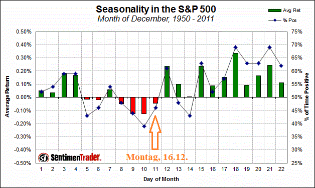 Jetzt wird vielleicht der ein oder andere fragen: “Warum zum Teufel geht der Depp jetzt noch Long-Positionen ein?”. Darauf will ich mit einer Grafik antworten. Hier geht es um die Positionierung auf die Santa-Rallye. Am Montag ist Tradingtag 11. Wenn die Trades aufgehen werden sie planmäßig am ersten oder zweiten Tradingtag im Januar aufgelöst. Andernfalls werden sie ausgestoppt und dann bin ich mit dem Wikifolio nochmal -10% tiefer und damit zurück auf los. Das Risiko ist ganz klar hier in den Start einer größeren Korrektur eingekauft zu haben, das wird sich schon früh nächste Woche zeigen.