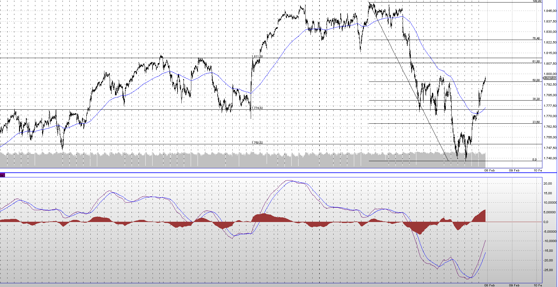 Die Bullen sind aktuell überlegen und auf einem aktiven kleinen Aufwärtstrend. Der Zuwachs von 50 Punkten in 3 Handelstagen ist aber sehr extrem und birgt die Gefahr von Mitnahmen. Viele werden sicherlich den MovingAverage 50 (daily) im S&P nutzen um ihre Gewinne mitzunehmen. Dort in der Nähe befinden sich auch alte Unterstützungen, die nun als Widerstand fungieren sollten sowie der MA20(daily). Es wartet also eine massive Widerstandzone ab 1805 bis 1825 auf die Bullen. Dort werden sich shorties positionieren und ich werde genauestens hinschauen wie stark sie sind.