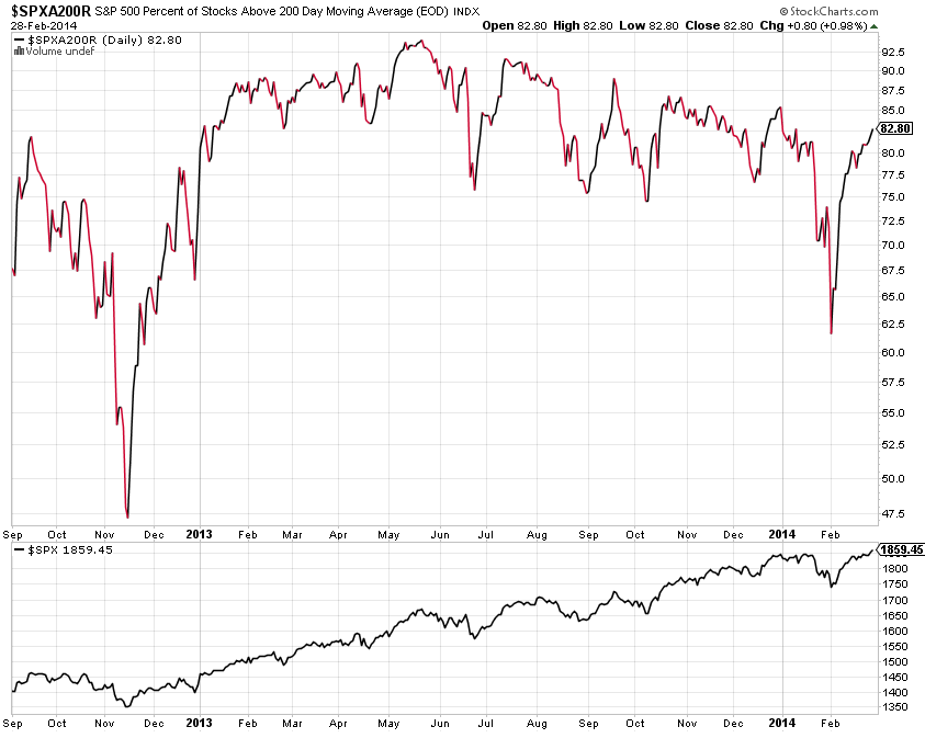 Auch im größeren Timeframe weiten sich die Divergenzen aus. Hier die Aktien, die oberhalb ihres MA 200 notieren. Seit Mitte letzten Jahres lassen die Werte immer mehr nach. Heißt, die Stärke des Marktes ist nicht mehr so breit getragen wie in der Vergangenheit.