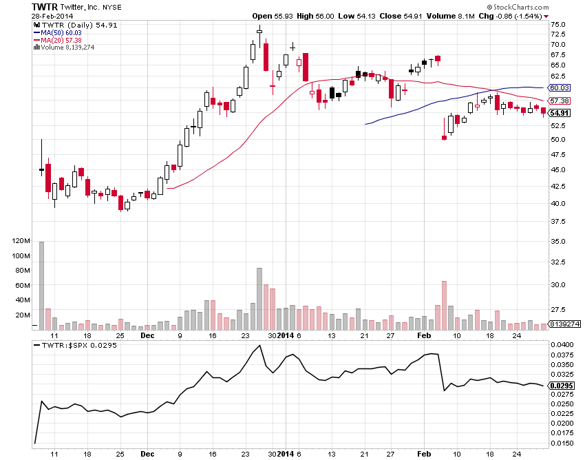 Das Gap Down Anfang Februar enststand als Twitter verkündete, dass das User-Wachstum nachlässt. Aus meiner Sicht ist das ein inflection point, denn das verändert die Gesamterwartungen des Marktes an die Aktie. Zudem dürfte es den investierten Anlegern doch einen gehörigen Schrecken eingejagt haben. Zwei Monte Wachstum wurden binnen einer Nacht zerstört und so werden sicherlich viele mit roten Zahlen im Depot noch da stehen. Klarer short aus meiner Sicht, leider im Wiki nicht umsetzbar.