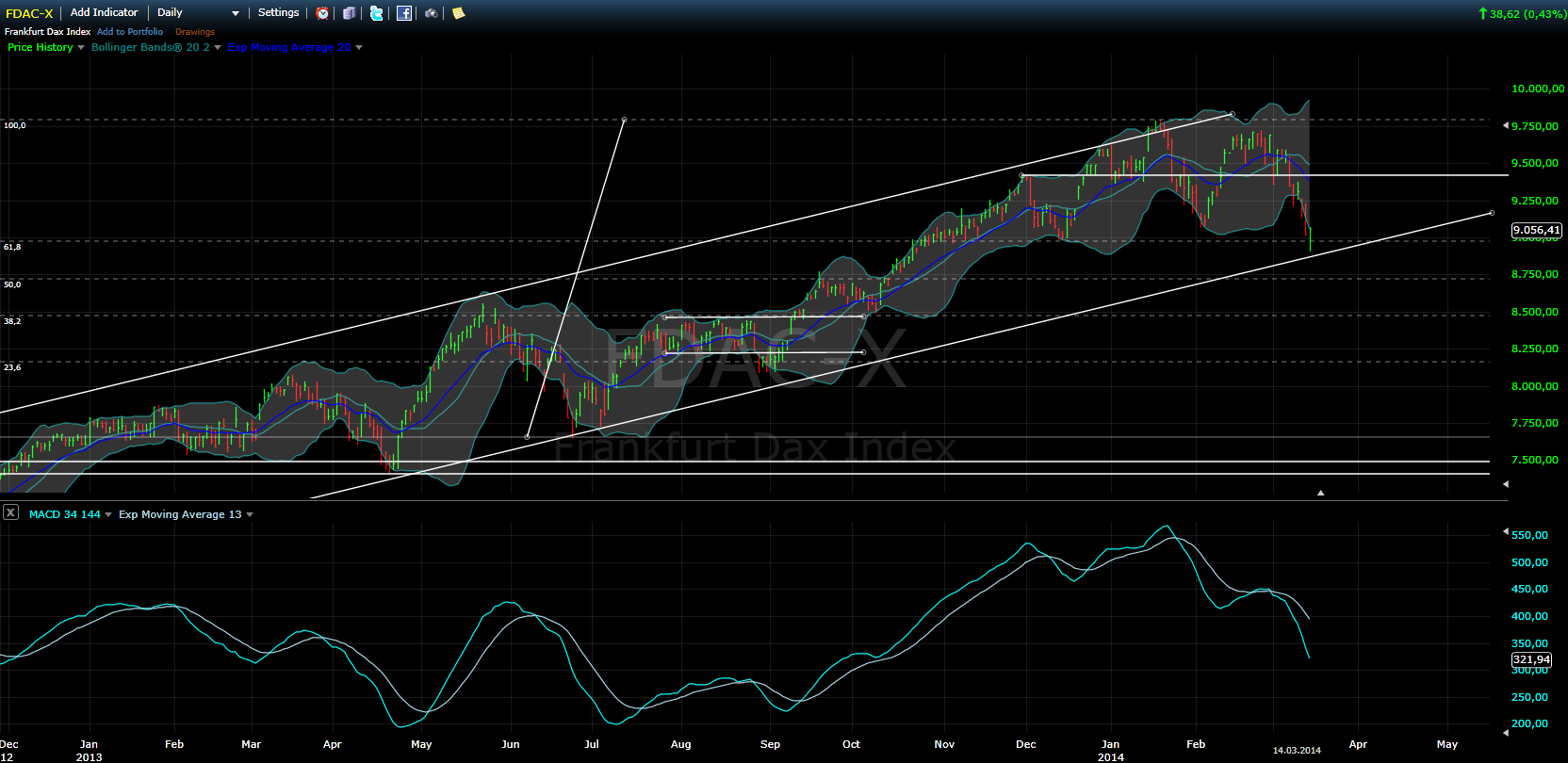 Die besagte 9.300-9.400 Zone deckt sich hier mit allen klassischen Widerständen: Top Nov/Dez13, 50-62% Fibo und eben das besagte mittlere Bollinger. Ich halte die Zone daher für extrem reizvoll für einen erneuten Shorteinstieg.