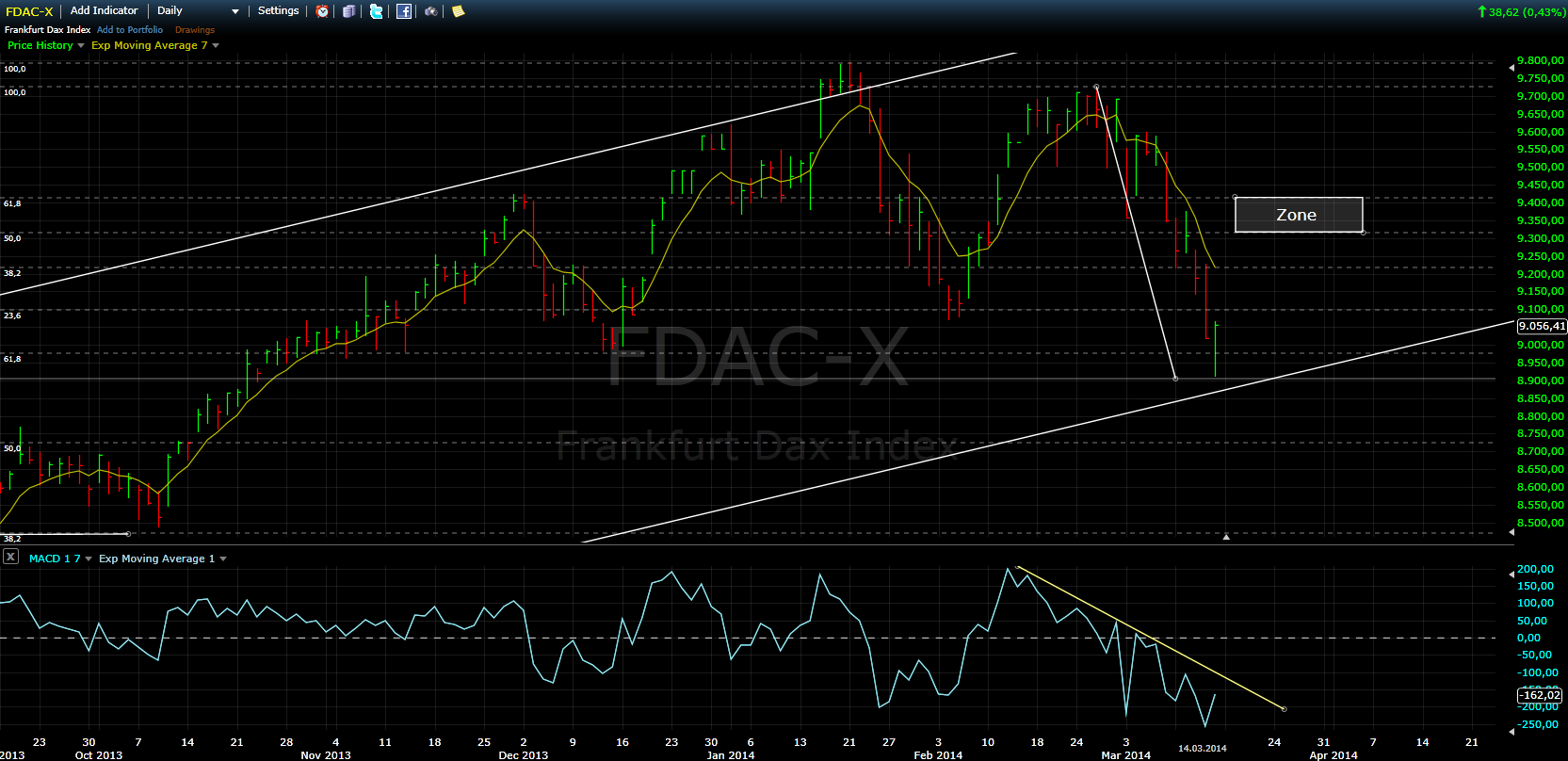 Vor zwei Wochen, bei etwa 9500 Punkten im DAX warnte ich vor den marktverändernden Folgen des Durcheinanders in der Ukraine. Mittlerweile konzentrieren sich die Medien auf die Halbinsel Krim, die von russischer Seite eingenommen wurde – anders kann man das nicht nennen. Das hatte verheerende Folgen in den Märkten und führte zu Panik-Verkäufen. Am heutigen Sonntag gab es nun das von westlicher Seite kritisierte Referendum mit einem überragenden Ergebnis für die Russen. Auch wenn es Europa und USA nicht akzeptieren werden, bin ich der Meinung, dass es erst einmal für Klarheit sorgt und damit eine Grundlage für eine Erholungsrallye bildet.