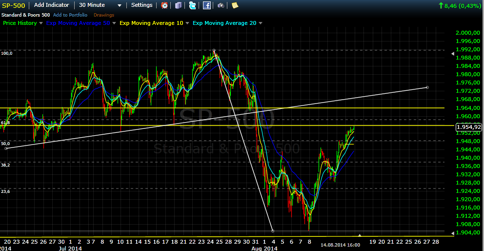 Ich bin Stand heute (Donnerstag) eher bullish als bärisch. Allerdings brauche ich ein Close über dem MA50 Daily im S&P um den kleinen Bären in mir in den Schlaf zu schicken. Freitag, bzw. spätestens nächsten Montag haben wir Klarheit. Zwischen den zwei gelben Widerstandslinien werden wir die Stärke der Bären messen können. Bin gespannt (und eher an der Seitenlinie)