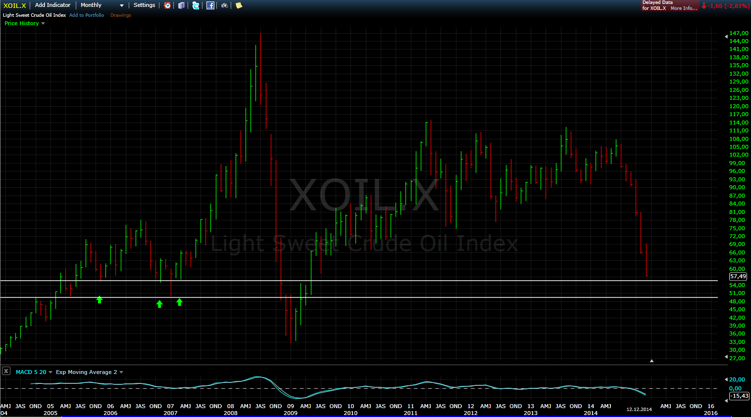 Vor dem bullishen Ausbruch in 2007 war der Bereich von 50-55$ eine wichtige und oft getestete Unterstützung. Ich schäte (!) einmal, dass sich dort in der Nähe für die Ölproduzenten wichtige Kostendeckungsbeträge verstecken. Auch ganze Staatshaushalte brauchen Mindestpreise für Öl, diese liegen bei den meisten allerdings weit oberhalb von 50$… Das Kostendeckungsarguent halte ich für wichtig in der aktuellen Situation von Russland. Dort hat die Situation vor allem in Kombination mit dem fallenden Rubel Spregpotential. Das setzt Russland sehr stark unter Druck setzt und wer weiß zu welchen Entscheidungen das dort führen wird. Nur deshalb muss man das Geschehen rund um die Preisentwicklung dort im Auge behalten.