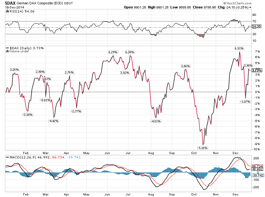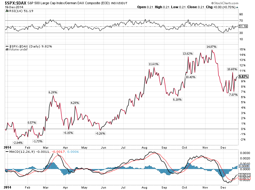 Zu sehen ist die relative Performance des S&P500 ggü. dem DAX. Seit Einsetzen der Russland/Ukraine Krise im Sommer hat der S&P den DAX um schlappe 10% (!) outperformed. In anderen Worten: Hätte ich einfach den S&P gehandelt, nehmen wir mal an, er wäre währungskursneutral, hätte ich einen Vorteil von 10% gehabt, gehebelt bis zu 20%. Ja, ich weiß, ein bißchen Milchmädchenrechnung, ABER: Ich handle den DAX nach Signalen aus den US-Märkten. Die Signale haben unterschiedliche Auswirkungen. Es kommen wieder Zeiten, da werden die gleichen Signale eine relativ bessere Performance des DAX mit sich bringen. Dieses Jahr war diesbezüglich einfach nur Pech.