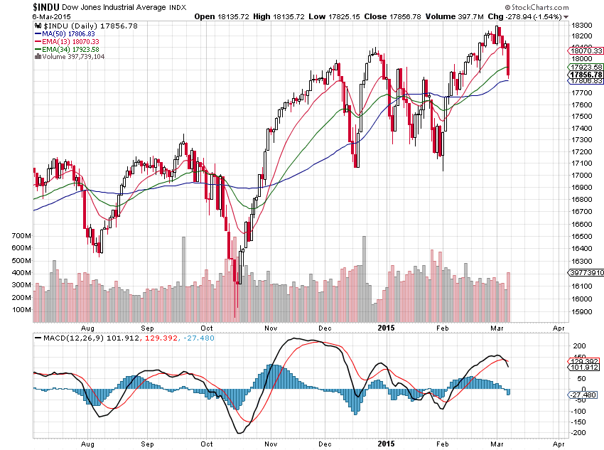 Was macht mich bärisch? Der Reihe nach. Zunächst einmal der S&P und der DowJones, die jeweils den EMA13 das erste mal negativ durchbrochen haben, aber beide vor starken Unterstützungen aufgefangen wurden. Im S&P Ist es der Bereich um 1965, im DowJones 17.800. Beide werden zudem noch vom MA50 “flankiert”. Eine insgesamt sehr starke Unterstützung, die für einen Rebound, spätestens am Dienstag sorgen sollte.