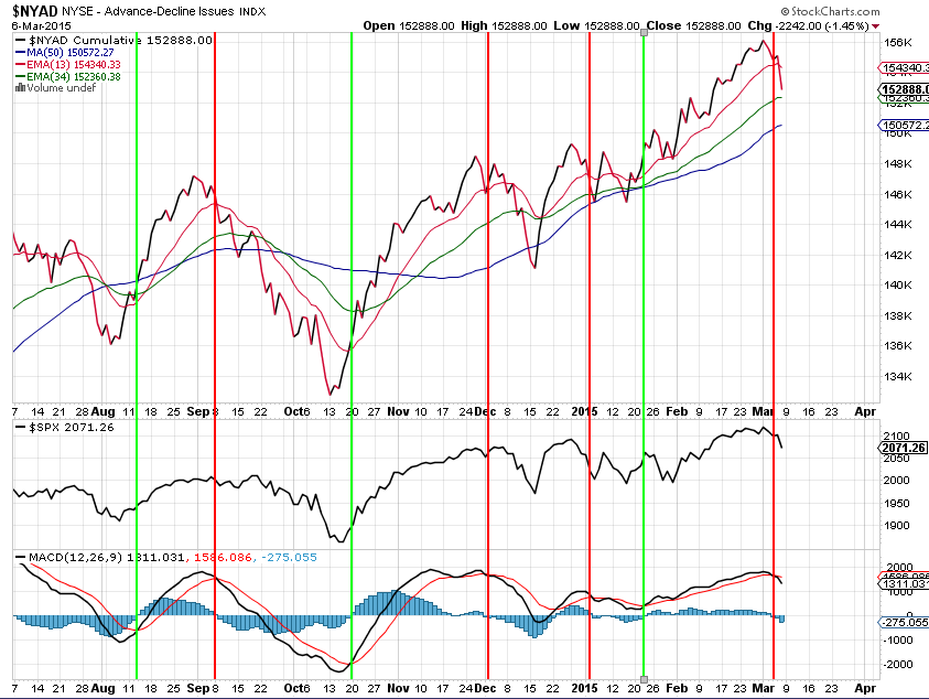 Die NYAD-Linie zeigt es “roh” in Kombination mit dem klassischen MACD auch ganz schön, dass tendenziell eine schwächere Phasen anbrechen sollte: