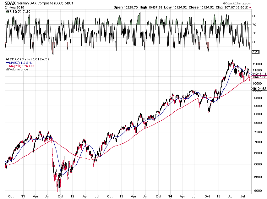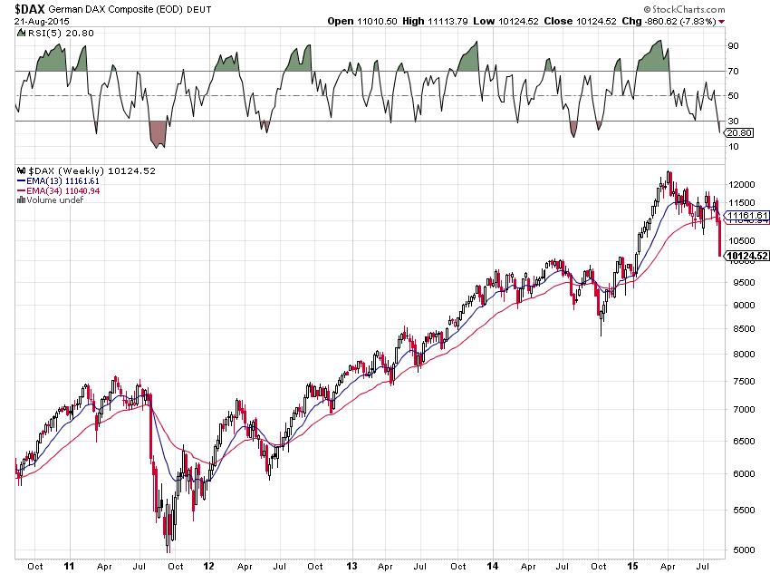 Der DAX hat in der letzten Woche mehr als-10% verloren und damit die gesamten noch vorhandenen Jahresgewinne hergegeben. Es war die schwächste Wochenperformance seit über 4 Jahren! 500 Punkte fehlen noch, dann wäre auch 2014 egalisiert. Das wird viele konzeptlose Anleger wieder nervös werden lassen. Ich bin sicher, dass viele bereits schwitzen. Spätestens wenn der Marktrückgang stärker in der Presse thematisiert wird, wird aus Schweiß echte Angst.
