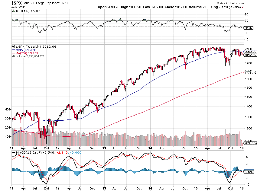 - Die Charts der US-Börsen. Mit dem Fall heute hat sich der 200er Moving Average als Widerstand erwiesen. Die Abwärtsrichtung scheint vorgezeichnet. Ich bin nicht nur deshalb dieses Jahr bereit auch mit größeren Positionsgrößen shorts zu handeln. Der Bullenmarkt ist markt- bzw. charttechnisch erst einmal beendet. Vielleicht ist er nur unterbrochen, das wird sich erst in ein paar Wochen heraus stellen. Siehe Chart 4. Mich würde nicht wundern, wenn wir dieses Jahr auch mal den MA200 des Wochencharts erreichen.
