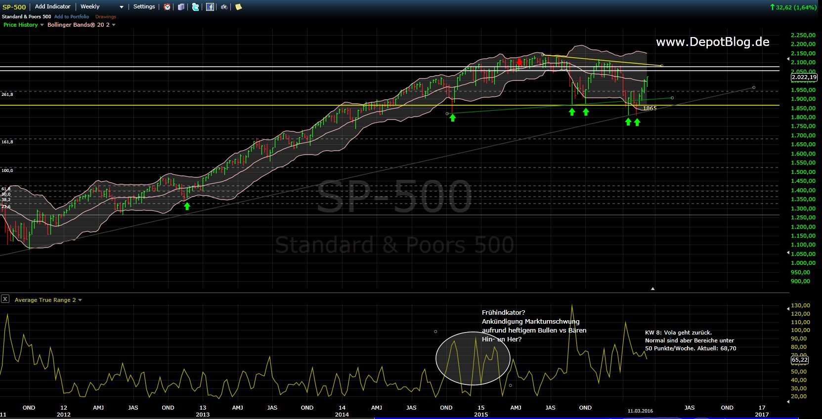 Der Chart oben ist unter mehreren Gesichtspunkten interessant, finde ich. Man kann schön sehen, dass in ruhigen, bullishen Phasen die ATR-Range von 2 Wochen sich im Bereich von 50 Punkten abspielt (für den S&P500). Seit Mitte 2015 allerdings, gibt es weit extremere Ausschläge. Diese gingen bis hin zu 120 Punkten beim Mini-Crash im Sommer letzten Jahres. Der Chart gibt aber noch mehr her: