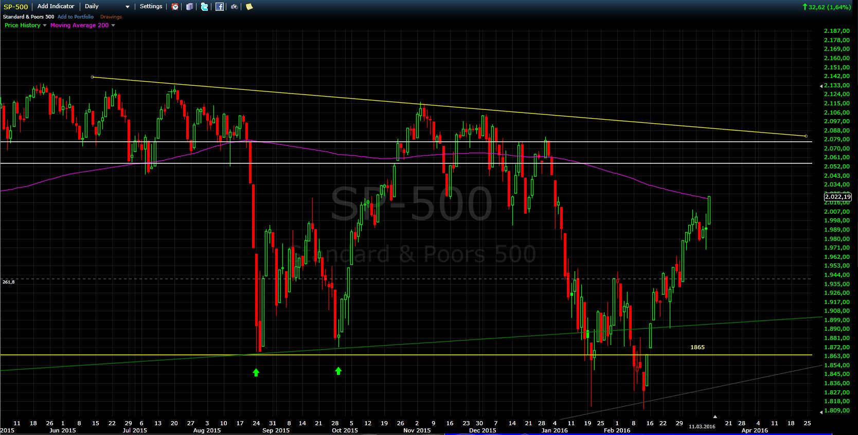 Ich habe im Chart oben eine grobe Zielrichtung eingezeichnet, die sich rein aus chart- bzw. markttechnischen Gesichtspunkten heraus ergibt. Der Bereich von 10.250 – 11.000 ist aus meiner Sicht bis Mitte bzw. Ende April erreichbar. Bei etwa 10.300 Punkten verläuft der MA200, der bis dahin mit sehr großer Wahrscheinlichkeit erreicht wird.