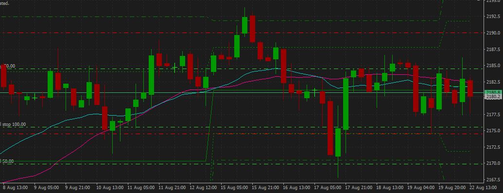 Seit Anfang August bewegt sich der Index in einer engen Spanne zwischen ca. 2175 und 90 Punkten wild hin und her. Dabei werden neue Tiefstände mit einer großen Abwärtsbewegung wie am 17.8. mit Schwung rausgenommen um innerhalb weniger Stunden komplett in der anderen Richtung wenig später neuen Zwischenhochs zu markieren. Wer dann glaubt, ok – das Tief ist markiert worden wird dann wieder enttäuscht. Heute wieder das selbe.