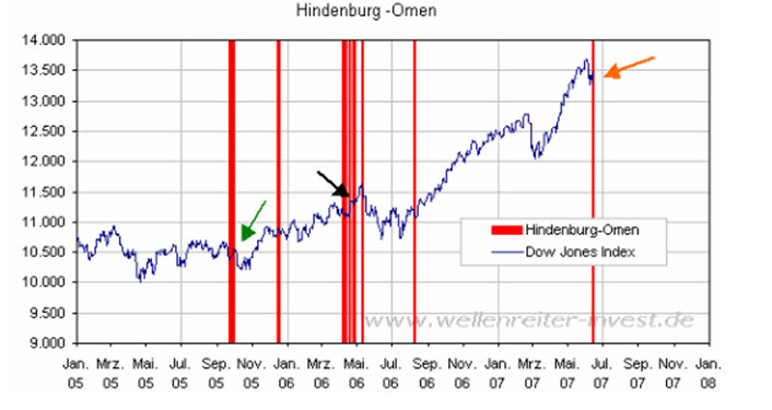 Bedeutet das Hindenburg-Omen also einen herannahenden Crash? Nein und nochmals nein! Es deutet auf eine Richtungsentscheidung beim Tauziehen um steigende und fallende Kurse, nicht mehr und nicht weniger. Das Ergebnis des Tauziehens bleibt offen!!