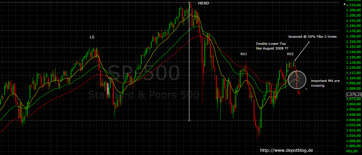 Im großen Bild auf Tagesbasis sieht die Situation gänzlich anders aus. Hier lässt sich die Bewegung der letzten Wochen und Monate auf ein lower Doppel-Top schließen. Eine extrem gefährliche Situation, die wir schon 2008 hatten, vergleicht einmal die Charts. Zudem kreuzen meine 3 bevorzugten MovingAverages negativ.