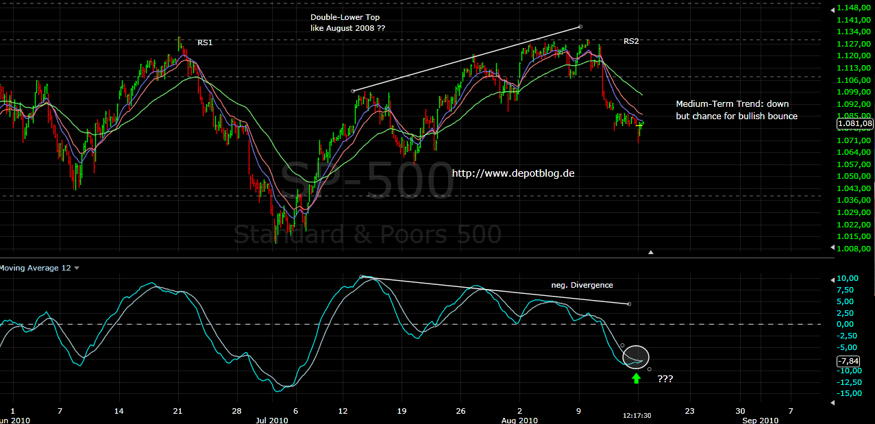 Wir haben es also mit einer höchst widersprüchlichen Situation zu tun. Kurzfristig bullish, mittelfristig eher bärisch. Was tun? Ich für meine Belange setze mich diese Woche auf meine Hände und warte ab. Ich setze mein sauer verdientes Geld nicht ein wenn die Lage unklar ist. Die Strategie wie ich in den Markt komme steht sowohl für den Fall dasss die Bullen gewinnen (und vor allem kenne ich den Punkt wann ich weiss, dass gewonnen wurde) und für den anderen Fall habe ich die StoppEntrys auch gesetzt. Bis sie erreicht werden kann es noch dauern. Oder auch nicht. Wer weiss das schon? Interessant finde ich aber, dass dieses lower Doppel-Top sowie eine große SKS in keinem mir verfolgten Blog oder Forum erwähnt wird derzeit, im Juni dagegen, als sich RS1 bildete war davon überall zu lesen – und da war für mich klar, dass die SKS keine Relevanz haben wird, nicht nur weil es alle auf dem Schirma hatten, vor allem auch weil die rechte Schulter total “verkrüppelt” aussah.