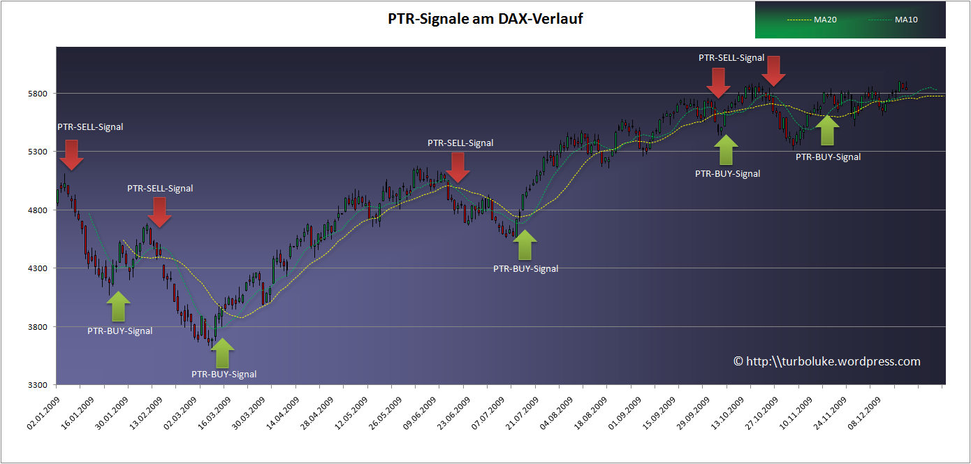Hier ein Singnalbeispiel im DAX Handel eingezeichnet für das Jahr 2009: Übrigens, ein MA10 vs. MA20 System – so blöd es klingt hätte wahrscheinlich 90% aller Fondsmanager abgehängt ;)