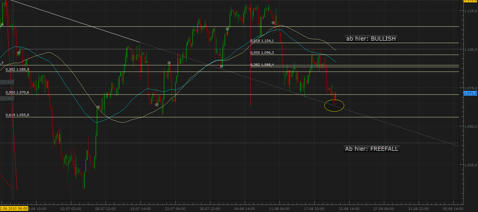 Die Abwärtstrendlinie, die schon mehrere Male ihre Gültigkeit unter beweis stellen durfte, hielt nicht nur sondern konnte sogar Käufer in den Markt locken. Das zeigen die letzten 3 Kerzen. Eine lupenreine Umkehrformation. Deshalb glaube ich, dass es zu Beginn der Woche grün werden könnte und der Bereich um 1085 – 1090 getestet werden wird. Dort verlaufen gleich 3 wichtige Fibo-Retracements und deshalb denke ich, dass diese Zone wichtig sein wird und es ist davon auszugehen, dass eine erste Bewegung irgendwo dort ihr Ende finden könnte.