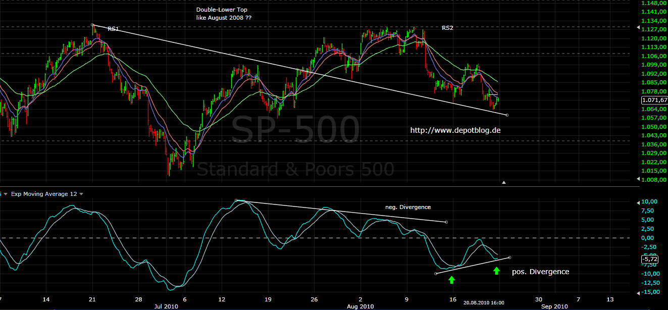 Zu sehen ist die eben schon angesprochene Trendlinie aber auch die pos. Divergenz im MACD. Es handelt sich um den gleichen Chart, den ich schon letzte Woche vorstellte. Das erste grüne “up” war damals goldrichtig . Jetzt werden wir sehen müssen ob das zweite “up” ebenfalls Bestand haben wird.