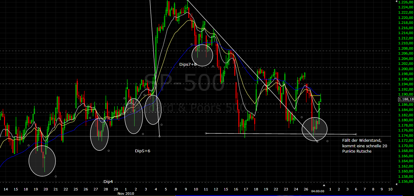 Ich kann dennoch keiner Partei derzeit, d.h. für die kurzfristige Richtung eine Vorteil zuschreiben. Zwar durchbrach der DowJones heute den weit beachteten MA50, der mehrere Tage halten konnte aber die Bullen sind weiter zur Stelle. Zumindest habe ich heute mit einem derart starken Rebound nicht gerechnet, schlappe 15 SPX Punkte und auch wenn der Bärentrend intakt ist (lower lows, lower highs seit 16.11.) heißt es für Bären weiterhin höchste Vorsicht. Die Märkte sind derzeit nicht berechenbar und so bin ich beim “Hit & Run”, oder für viele von uns verständlicher: Die schnelle Rein&Raus-Nummer ;-) Depotstand im Projekt: 2.718,58 Euro und 2 shorts offen (SPX und DAX)
