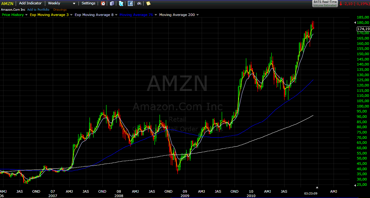 Auch wenn ich das Vorhaben verurteile, bin ich im Herz nun doch ein Börsianer und auf eine andere Art und Weise Blutsauger und so wanderten heute shorts auf AMZN in mein Depot zumal der Wochenchart nach Fahnenstange aussieht und förmlich nach Korrektur schreit. Ob der Angriff auf die Seite nun gelingt oder nicht (ich halte es für sehr unwahrscheinlich) – die Aktie von Amazon bleibt interessant. Hier der Wochenchart: